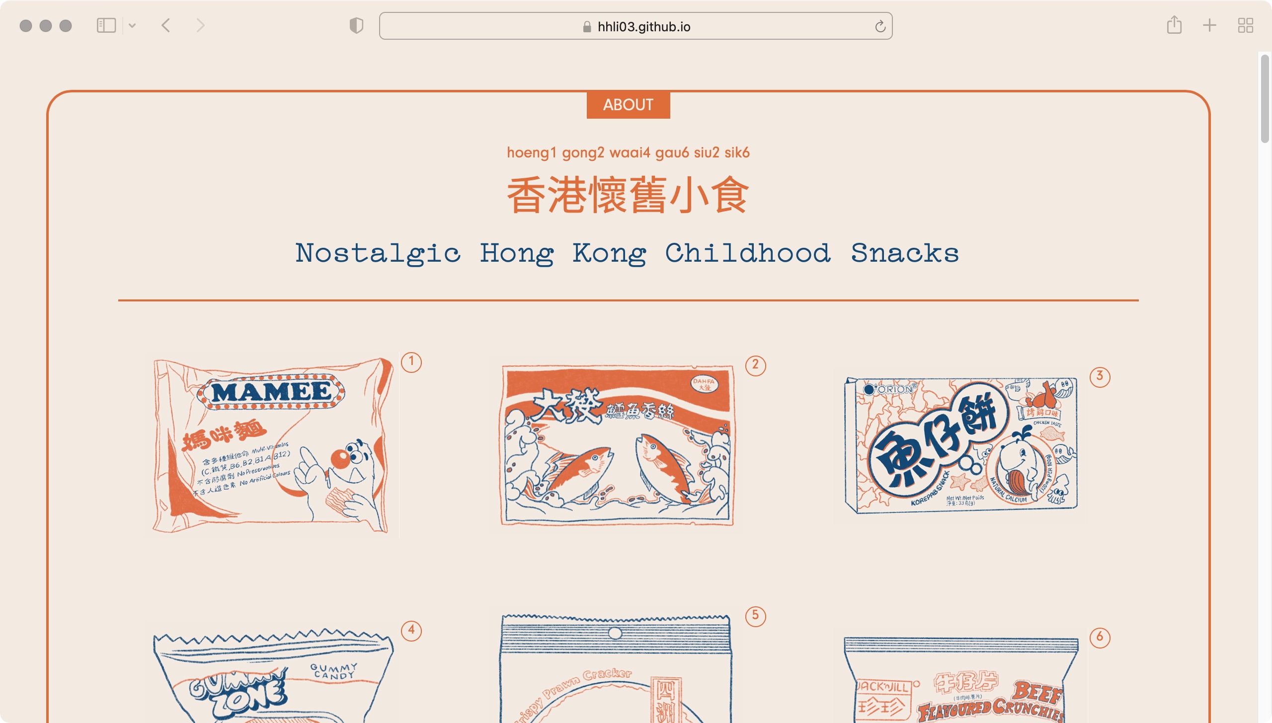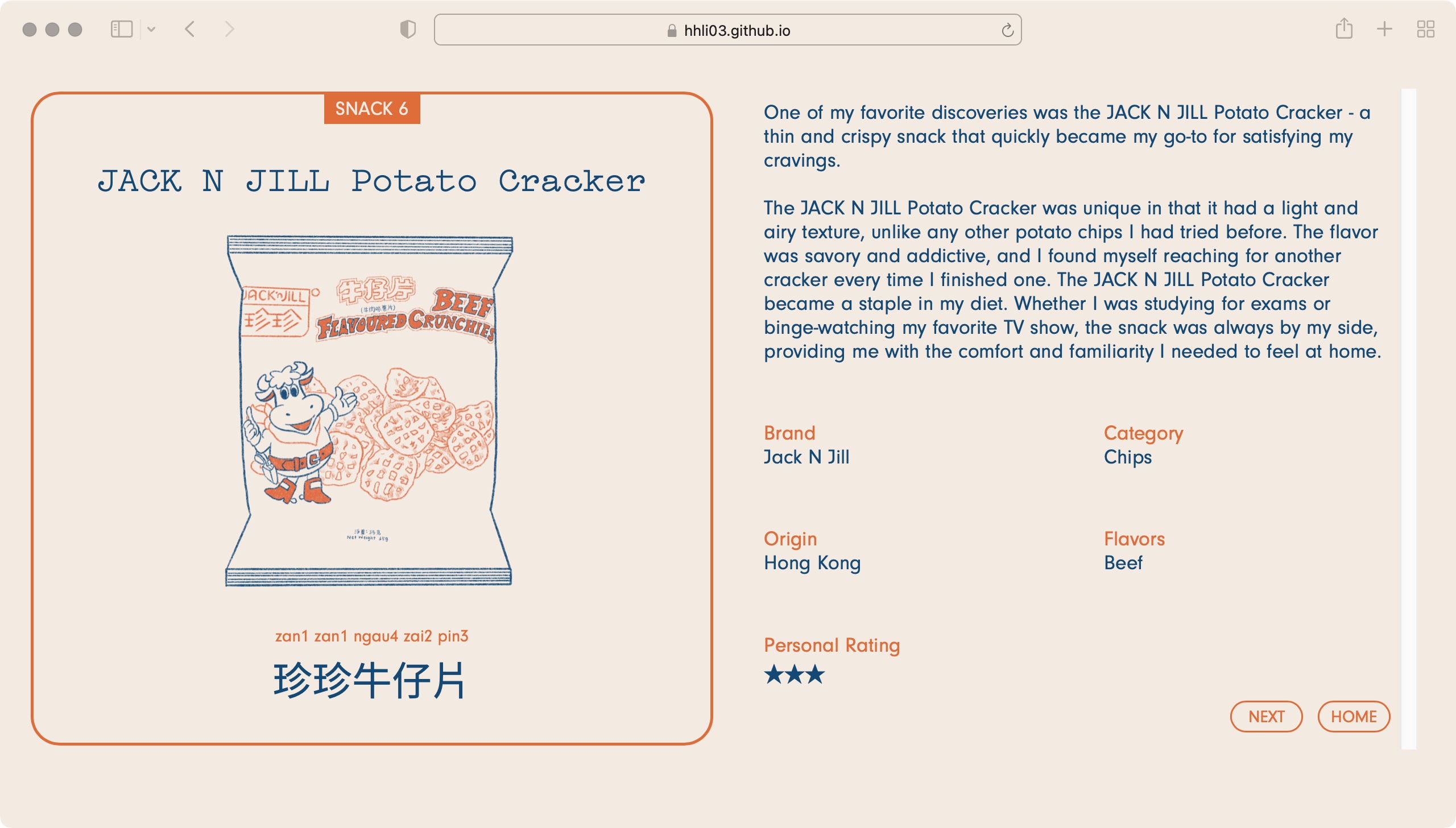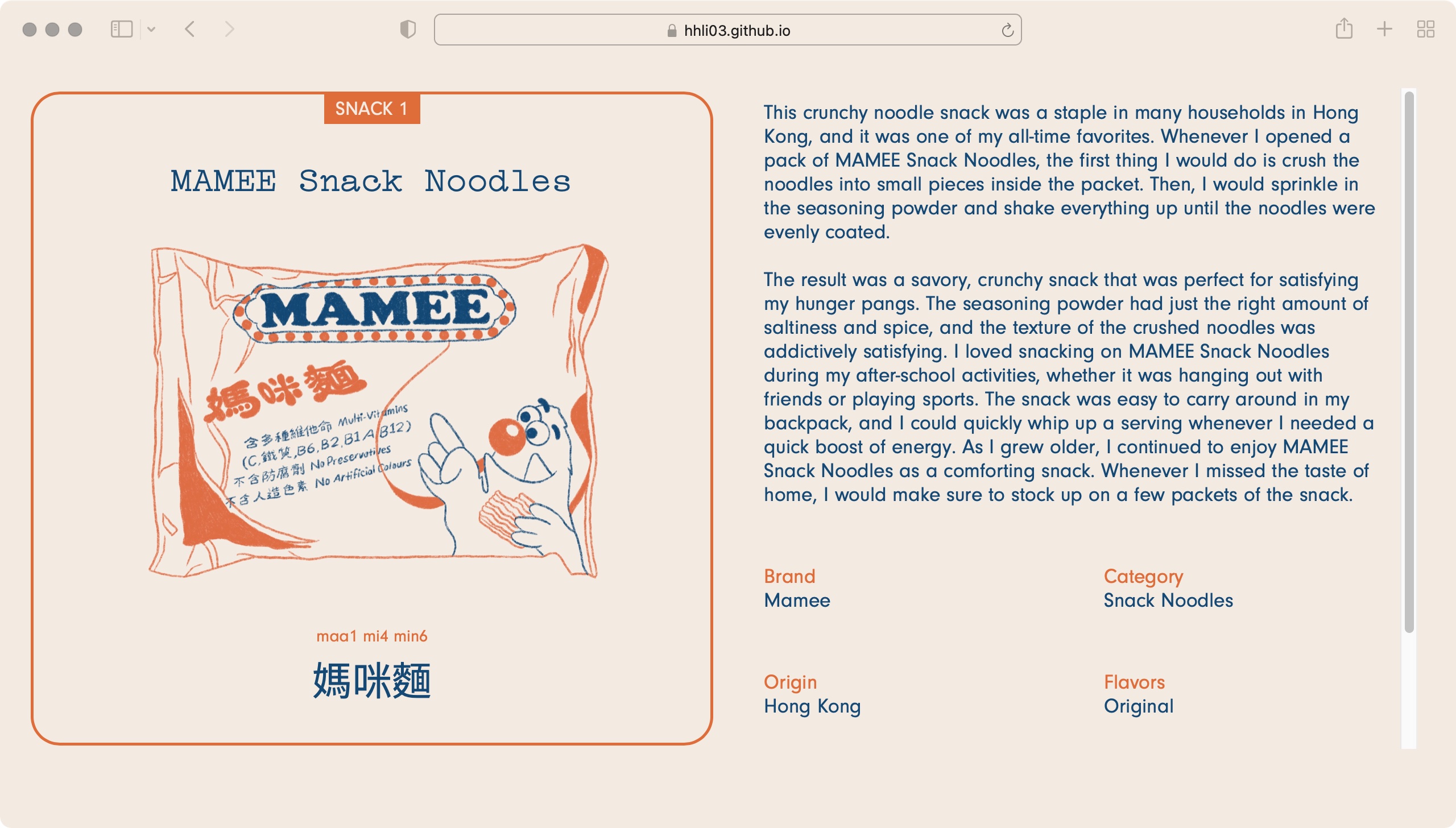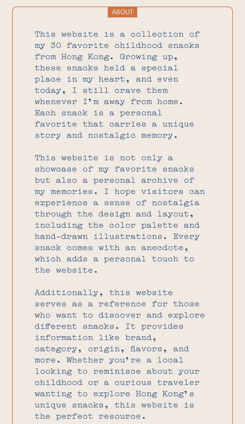 This website is not only a showcase of my favorite snacks but also a personal archive of my memories. I hope visitors can experience a sense of nostalgia through the design and layout, including the color palette and hand-drawn illustrations. Every snack comes with an anecdote, which adds a personal touch to the website.