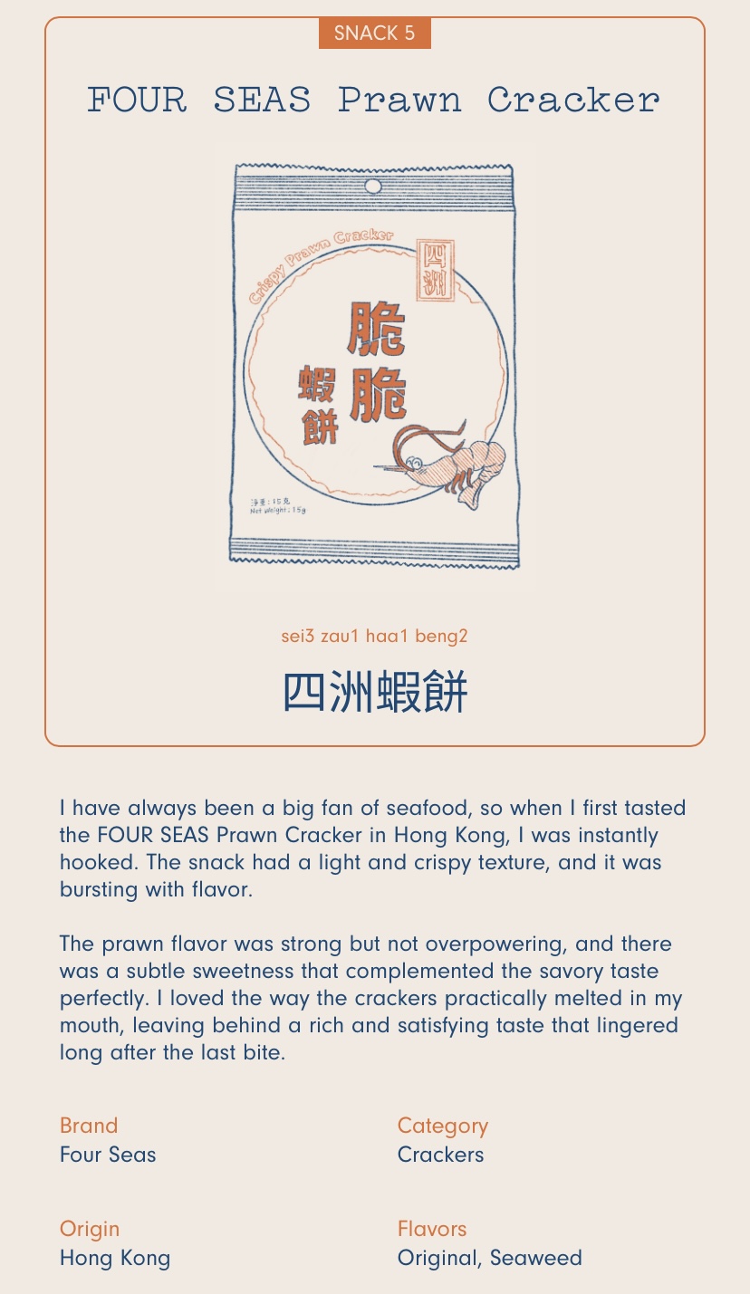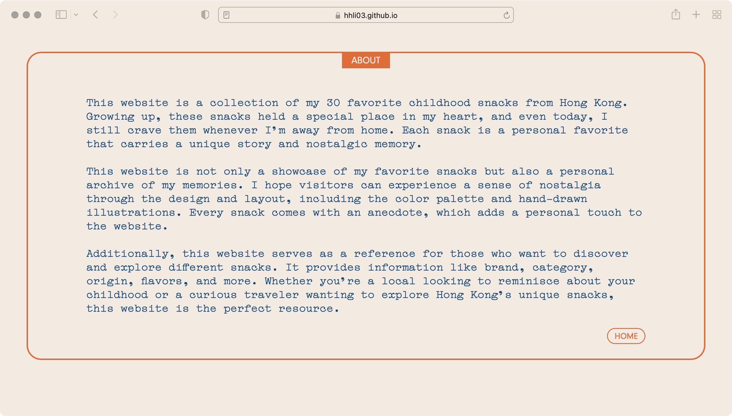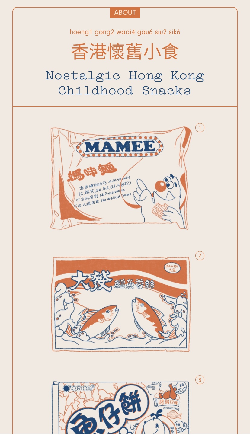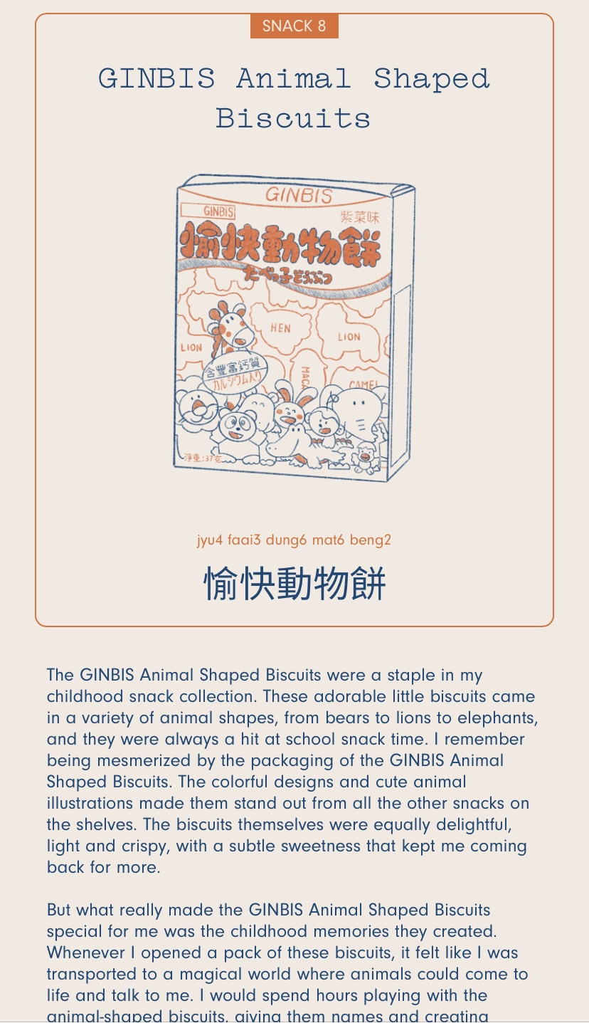 This website is not only a showcase of my favorite snacks but also a personal archive of my memories. I hope visitors can experience a sense of nostalgia through the design and layout, including the color palette and hand-drawn illustrations. Every snack comes with an anecdote, which adds a personal touch to the website.